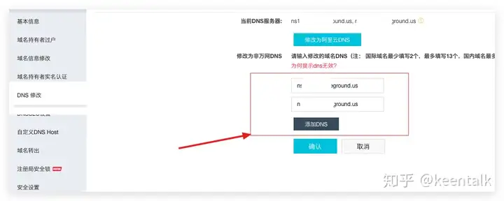 然后点击DNS修改,把之前复制的两个DNS修改过来,修改DNS之后生效需要几分钟到几小时不等。