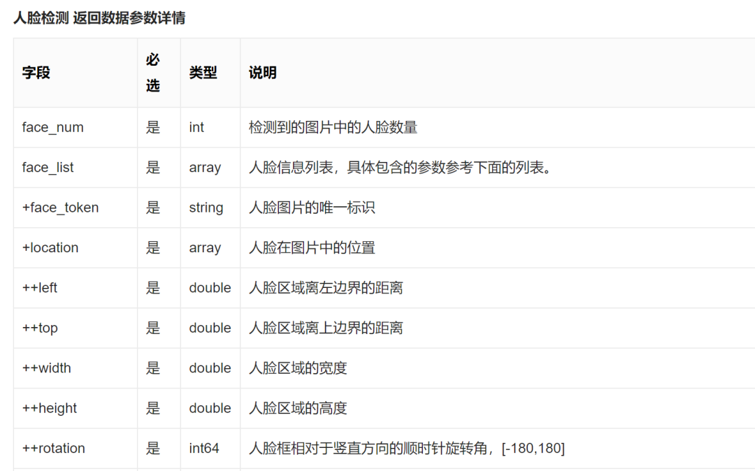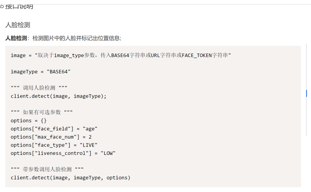 fromaipimportAipFaceimportbase64importjson""" 你的 APPID AK SK """APP_ID =xxxAPI_KEY =yyySECRET_KEY =zzzclient = AipFace(APP_ID, API_KEY, SECRET_KEY)f = open(./pic/muscle.jpg,rb)base64_data = base64.b64encode(f.read())读取文件内容,转换为base64编码image = base64_data.decode()f.close()imageType ="BASE64"""" 调用人脸检测 """result = client.detect(image, imageType)json_res = json.dumps(result,ensure_ascii=False)fh = open(./pic/muscle.txt,w)fh.write(json_res)fh.close()参考的文档是人脸检测: