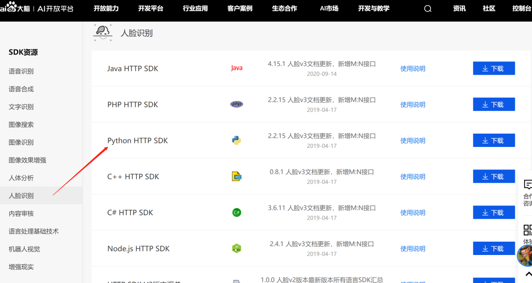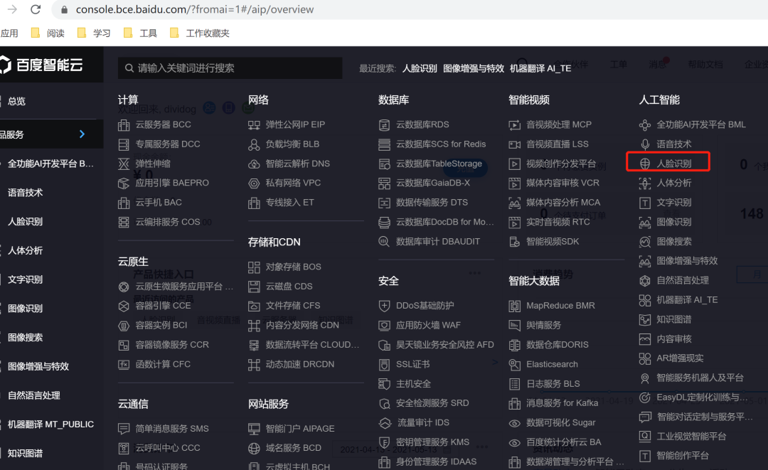 出现的界面如下,可以看到人脸识别都是免费使用的。