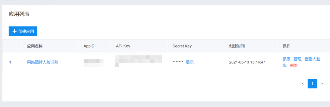 fromaipimportAipFace""" 你的 APPID AK SK """APP_ID =你的 App IDAPI_KEY =你的 Api KeySECRET_KEY =你的 Secret Keyclient = AipFace(APP_ID, API_KEY, SECRET_KEY)在上面代码中,常量APP_ID在百度云控制台中创建,常量API_KEY与SECRET_KEY是在创建完毕应用后,系统分配给用户的,均为字符串,用于标识用户,为访问做签名验证,可在AI服务控制台中的应用列表中查看。