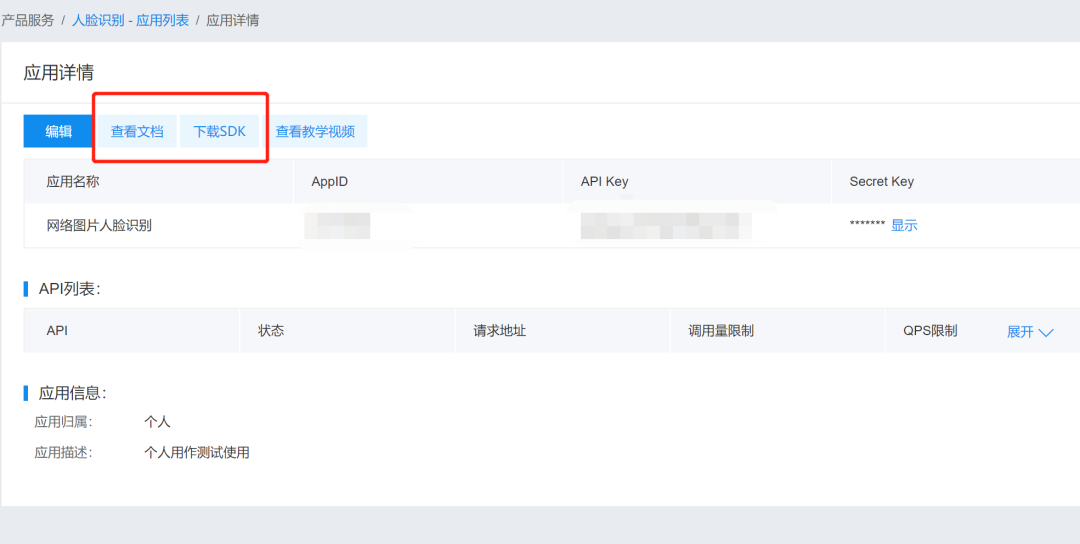 得到了AppID,API Key,Secret Key 三个请求SDK必备的参数。