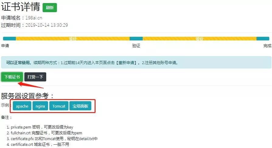 我们申请的SSL证书是Lets Encrypt,是终身免费使用的,但是需要每3个月就申请一次;除此外,还可以申请阿里云的免费域名,只要你的域名每年续费,就都有1年的免费证书。