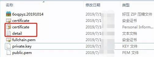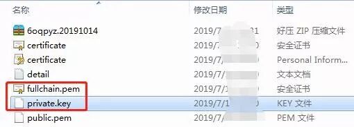 注:private的后缀在解压的时候可能是pem,可以自行改为key;fullchain则改为pem。