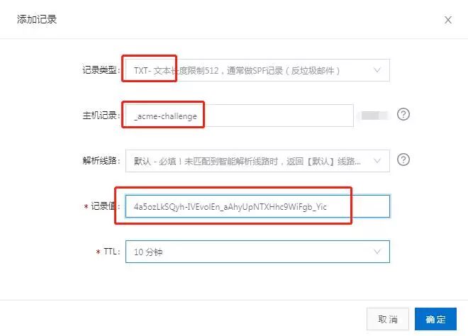3.4、选择DNS验证,需要在域名添加一条解析记录,如图所示: