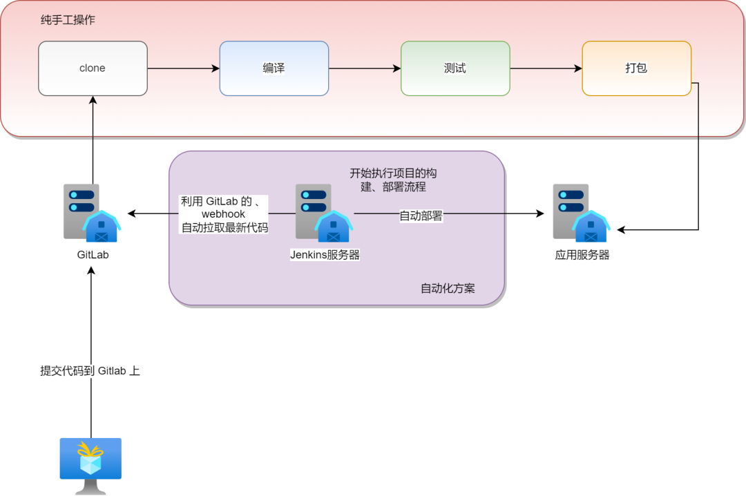 为什么会有集成地狱这个雅称呢?大家想想我们一个项目部署的过程,拉取代码->构建->测试->打包->部署,如果我们经常需要部署项目,特别是在微服务时代,服务特别多的情况下,不停的测试打包部署,那估计得有个人一整天专门做这事了,而这事又是繁琐的重复无意义的。
