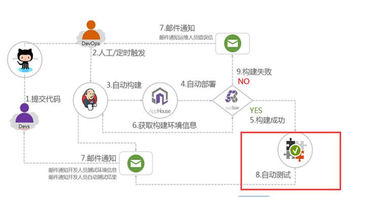 • 开发变更代码并提交到Git/SVN等仓库,Jenkins识别到开发代码的变更,按配置进行手动或者自动更新待测应用对应的Jenkins工程