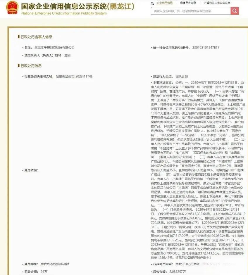 日前,国家企业信用信息公示系统显示,黑龙江千鲤财商科技有限公司因组织策划传销,被哈尔滨市道里区市场监督管理局新农所罚款98万余元。据行政处罚决定书显示,当事人利用微信公众号千鲤财商和小鹅通网络平台店铺千鲤财商招募、管理推广员。并存在下列行为: