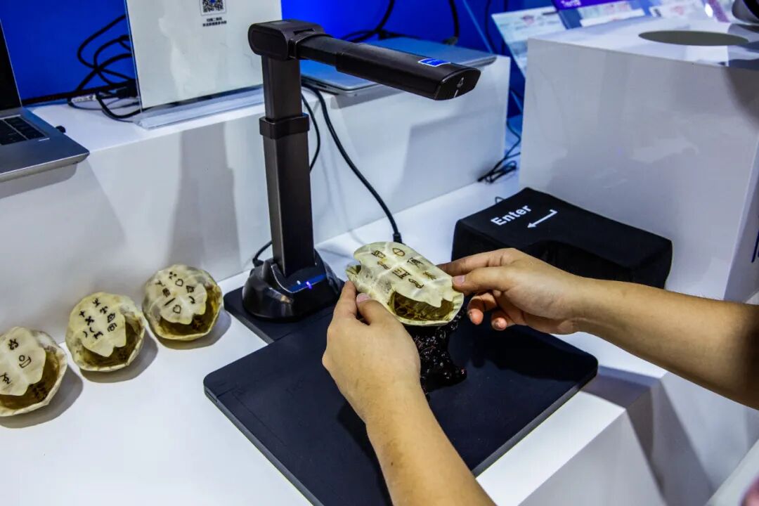 当天,合合信息展台引来观展者围观,该公司工作人员演示,通过智能文字识别技术,识别出3600年前中华文明的古老文字——多块复刻在仿制龟甲上形象丰富的甲骨文,只需一扫码,甲骨文即可同步被提取与翻译:白富美、买它买它等网络热词被识别翻译出来。目前这一技术处于内测阶段并首次在人工智能大会上展示,安阳殷墟景区作为这一技术的学术支持单位。