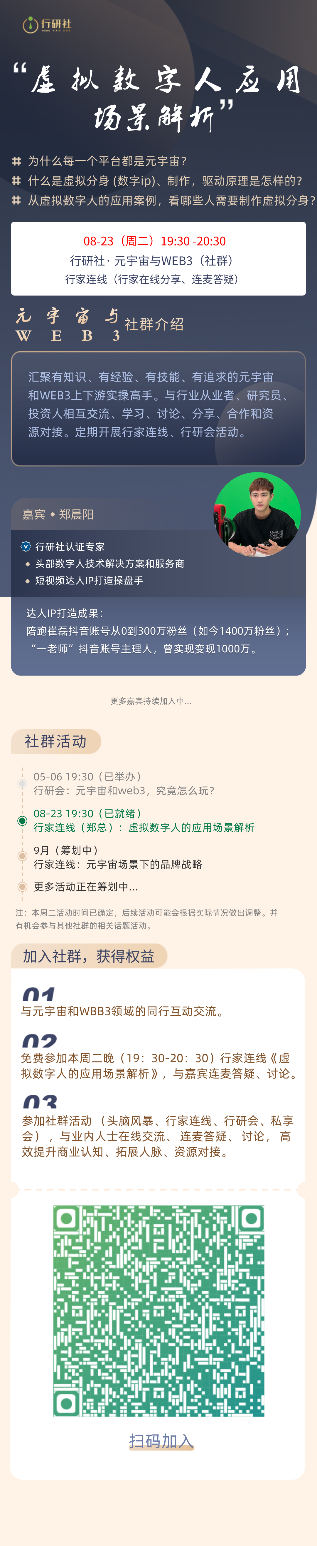 就目前而言是元宇宙未至,虚拟数字人先行。或许,虚拟数字人将是元宇宙应用第一个盈利领域。如果你想要了解更多数字人应用场景和行业。或者是需要将自己的产品融入数字人场景,欢迎加入行研社元宇宙与Web 3社群。本社群已经举办过若干次与行业专家在线互动会议。