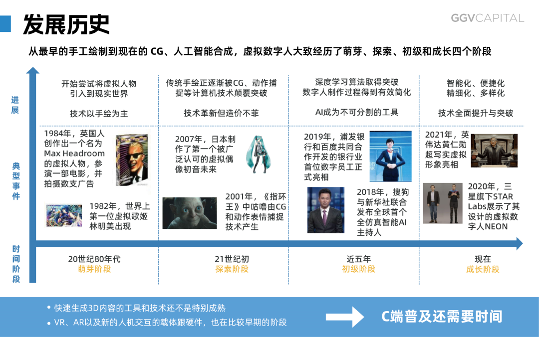 在21世纪初,计算机技术飞速发展,CG(计算机动画)技术和动作捕捉技术发展日益成熟,日本制作了第一个被广泛认可的虚拟偶像初音未来,对虚拟数字人的探索越来越丰富。