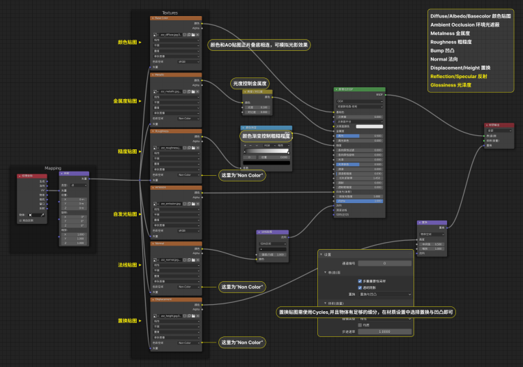 在blender中我们可以使用程序化节点达到想要的效果,但当模型导入到引擎,这个时候就需要通过贴图的形式来实现我们想要的效果,也就有了上面烘焙的这步流程,当然,相对程序化节点效果,PBR让更为真实但更加复杂更加消耗性能的光照模型算法变为可以大量被使用,在Blender中PBR纹理到底如何正确使用?下面介绍几个主要的贴图的设置方法。
