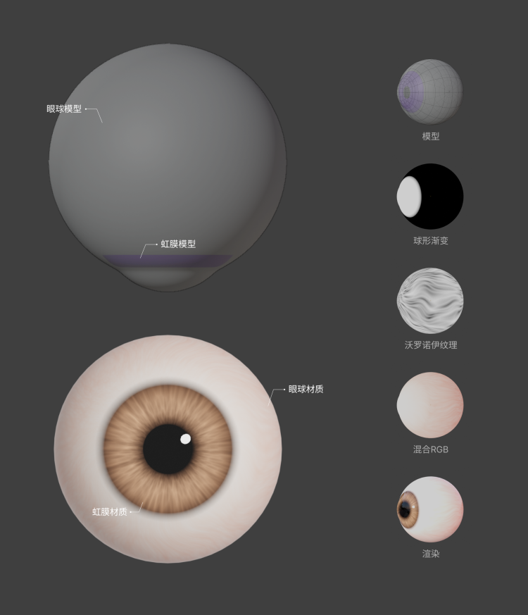 通过观察,我们在制作眼球的材质时可以将其归纳为白色基底、透明的角膜、眼球中的血丝三个部分: