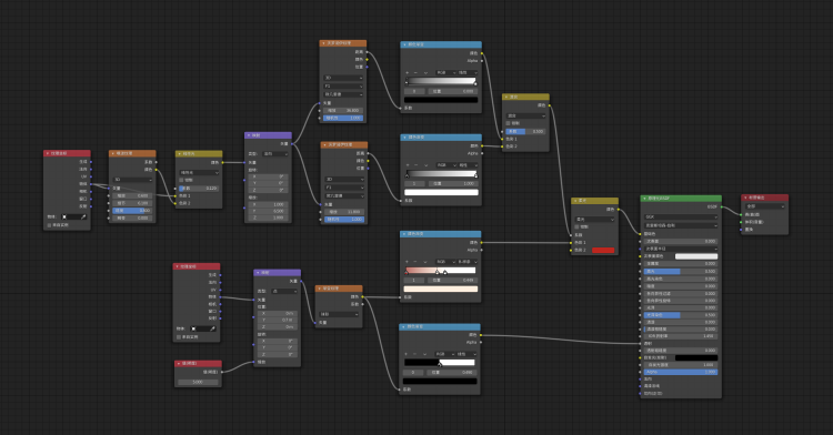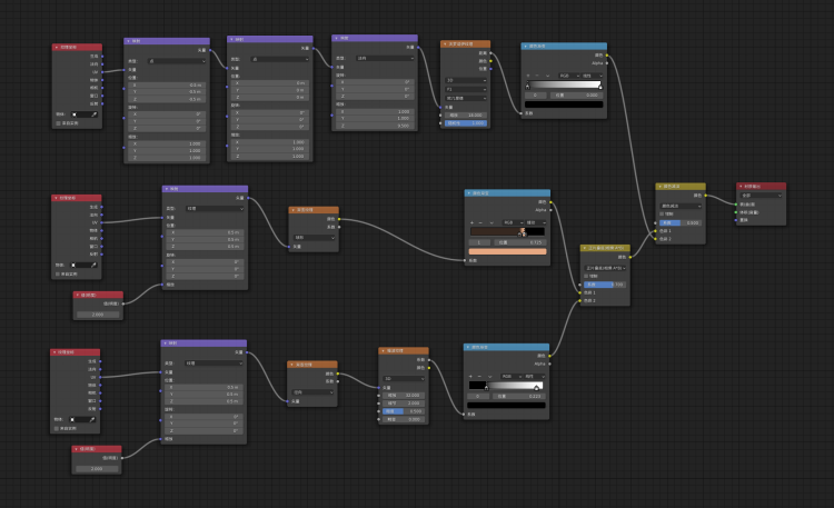 3)眼球中的血丝:眼球中的血丝可以分为底色和血丝部分,由于血丝的位置主要分布在白眼球处,所以可以复用前面的渐变纹理作为输入,新建一个渐变即可,通过调整渐变的范围即可以调整颜色分布。使用沃罗诺伊纹理作为血丝的纹理,由于该纹理具有一致的方向性,和血丝的不规则不同,故还需要通过噪声纹理对齐形状进行调整。然后将纹理染成红色并与底色柔光叠加即可达到血丝的效果,为了增加细节,可以再添加一些小血管,小血管的材质和大血管的流程完全一样,只是纹理的参数不同,通过增加沃罗诺伊纹理的缩放系数,来增加纹理的密度,并将大血管的输出通过混合节点混合后输出为血管纹理。