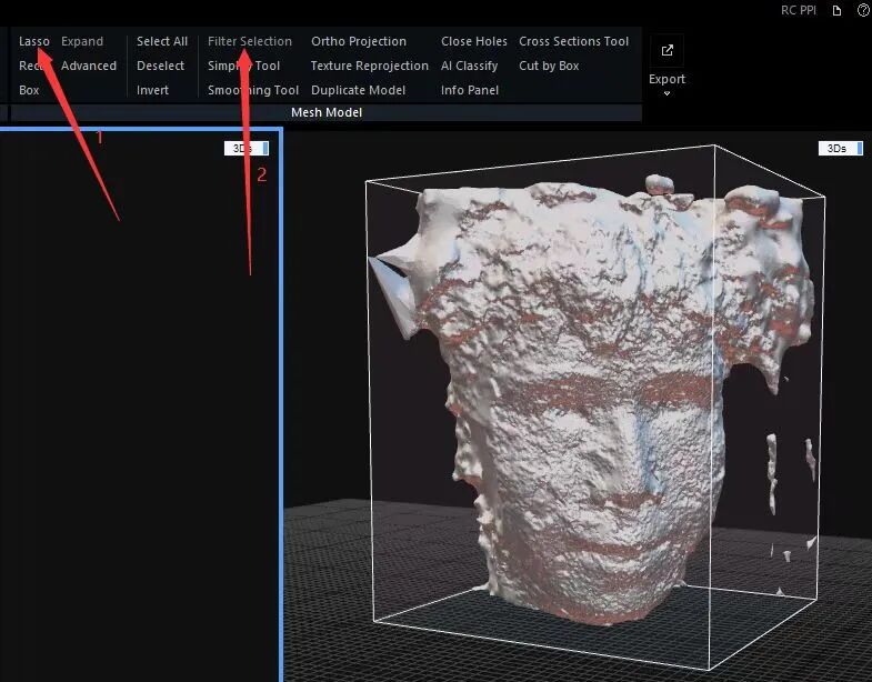 那么我们就需要使用Lasso套索工具画取任意想要清理的区域,选中的模型区域将由橙色高亮出来,在选取完不需要的模型区域(尽量把头发,配饰等全部去掉)之后,点击右侧Tools中的过滤选择(Filter Selection)按钮,即可得到剔除选中区域后进一步缩小范围的模型。