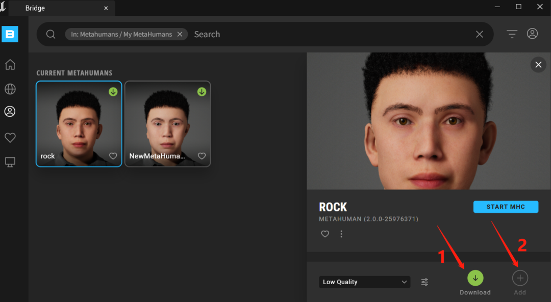 因为我们的模型都保存在我们EPIC账号下,所以我们先要登录自己的EPIC账号,然后就能在左边的MetaHumans-My MetaHuman看到我们账号下创建的模型了。