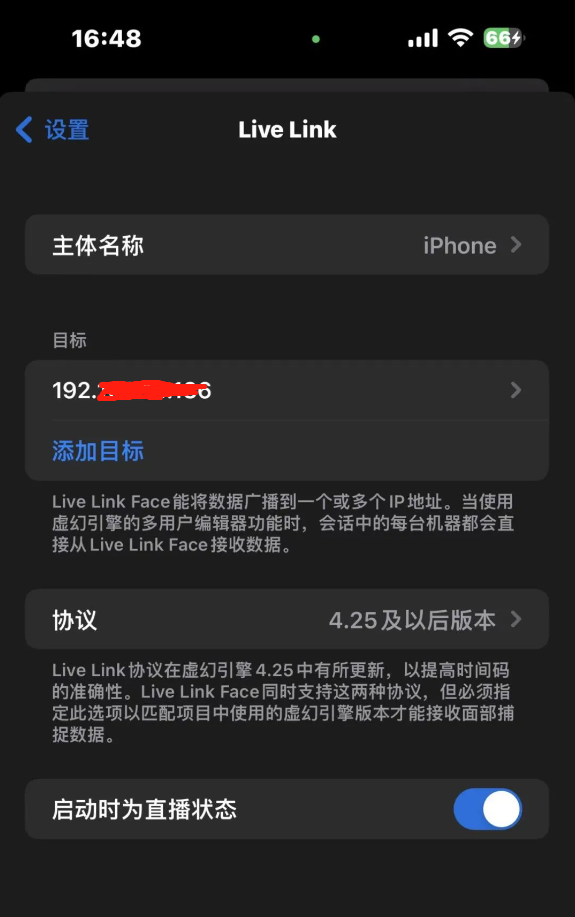 找到Live Link选项--添加目标--输入本机电脑的ip地址。(确保手机和电脑链接的同一个wifi喔)