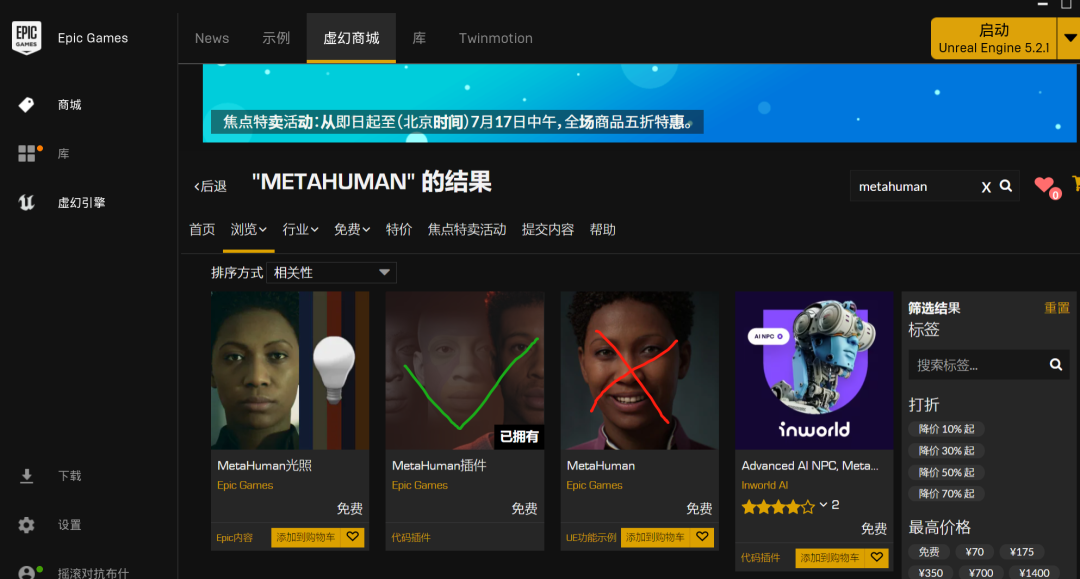 这里有一点比较特殊,我们首先需要在虚幻引擎商店里去提前下载好MetaHuman插件(插件名字是MetaHuman插件,别搞错了哟),这样才能在打开工程时能够找到MetaHuman选项。