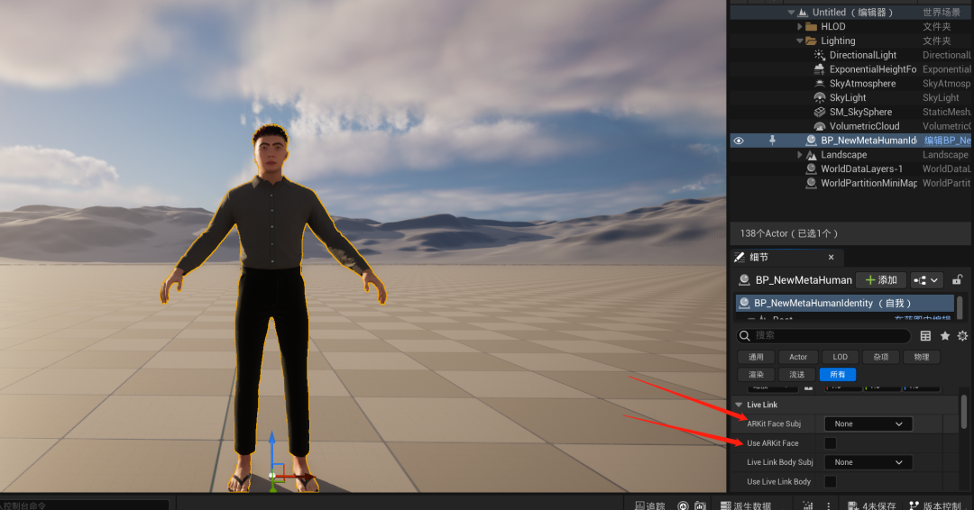 点击人物模型,在人物属性里找到Live Link--ARkit Face Subj选中刚刚发现的手机,勾选Use ARkit Face,这个时候,你可以对着手机开始说话了,然后。。。