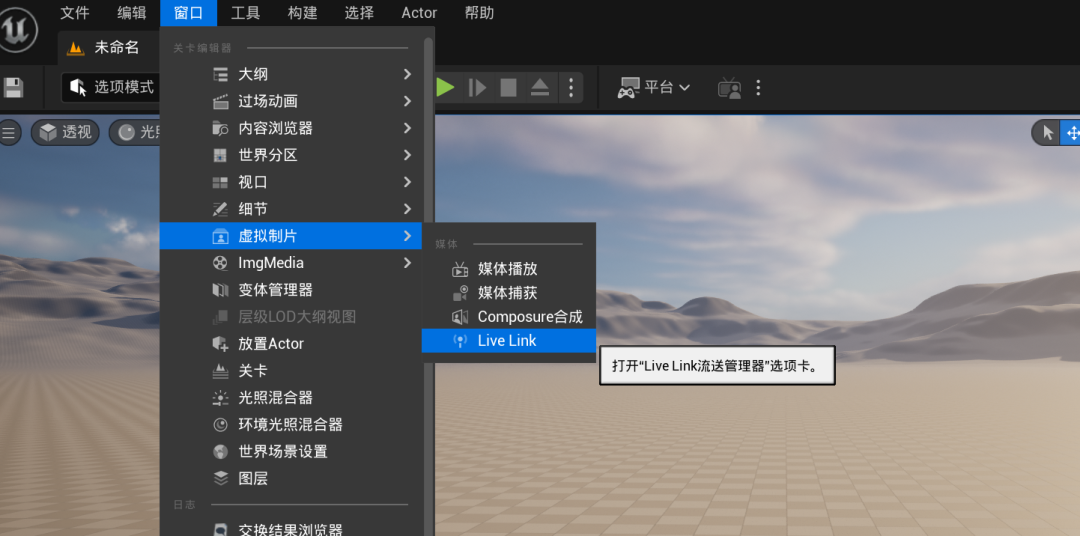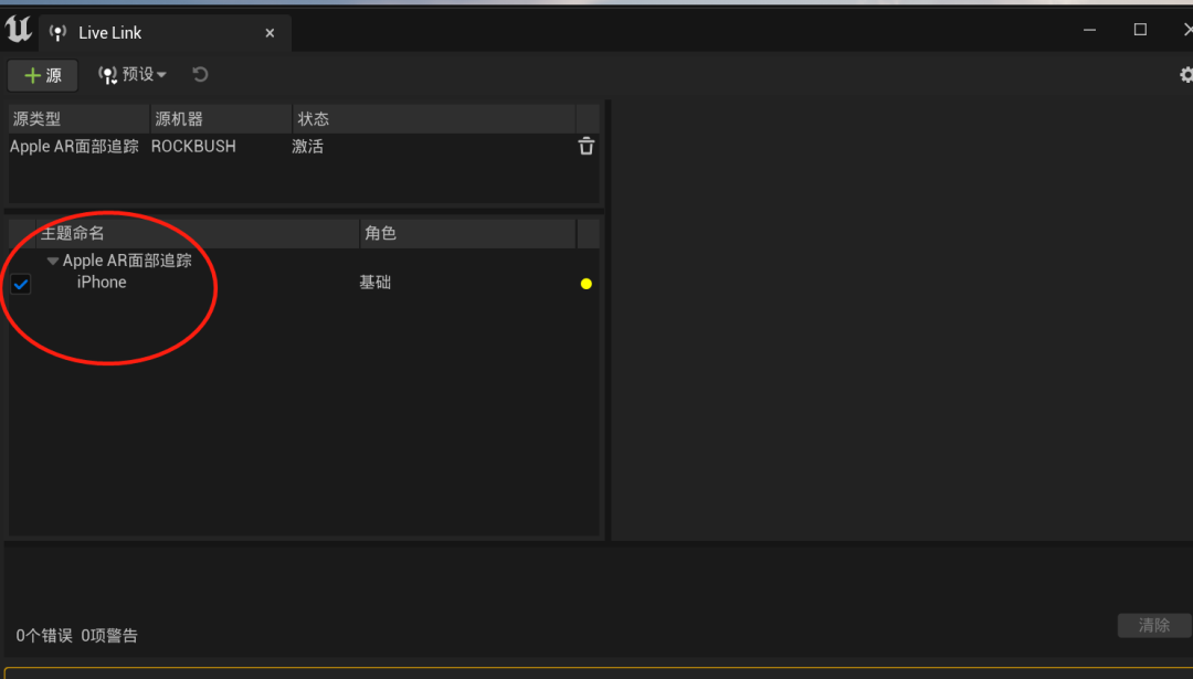 回到UE,点击窗口--虚拟制片--Live Link,如果一切顺利的话,等一下就会出现一个跟你手机名字一样的目标出现,确保打上了勾。