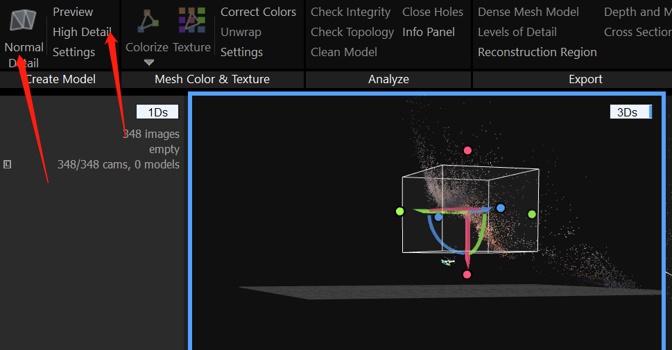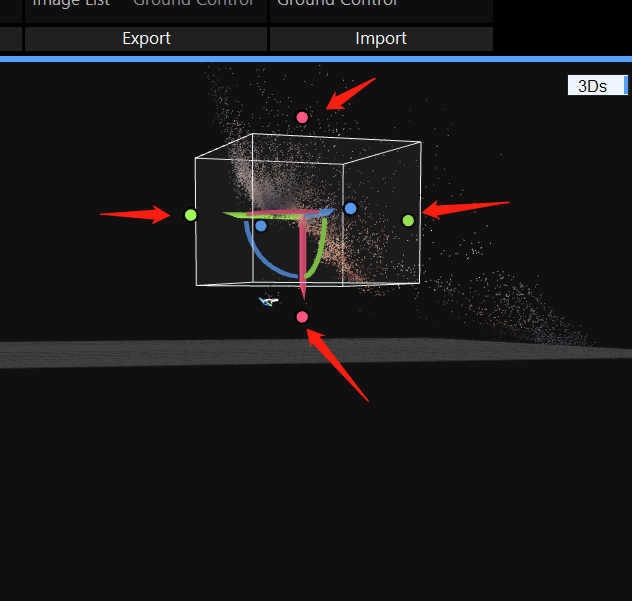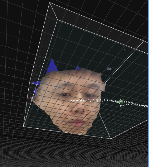 得到点云之后可通过拖动边框定位点(白色边框中)改变重建区域(即白色方框内部区域,如果要重建的只是单个人物模型,重建区域可以考虑调小一些,这样重建速度快且方便后续清除多余部分)