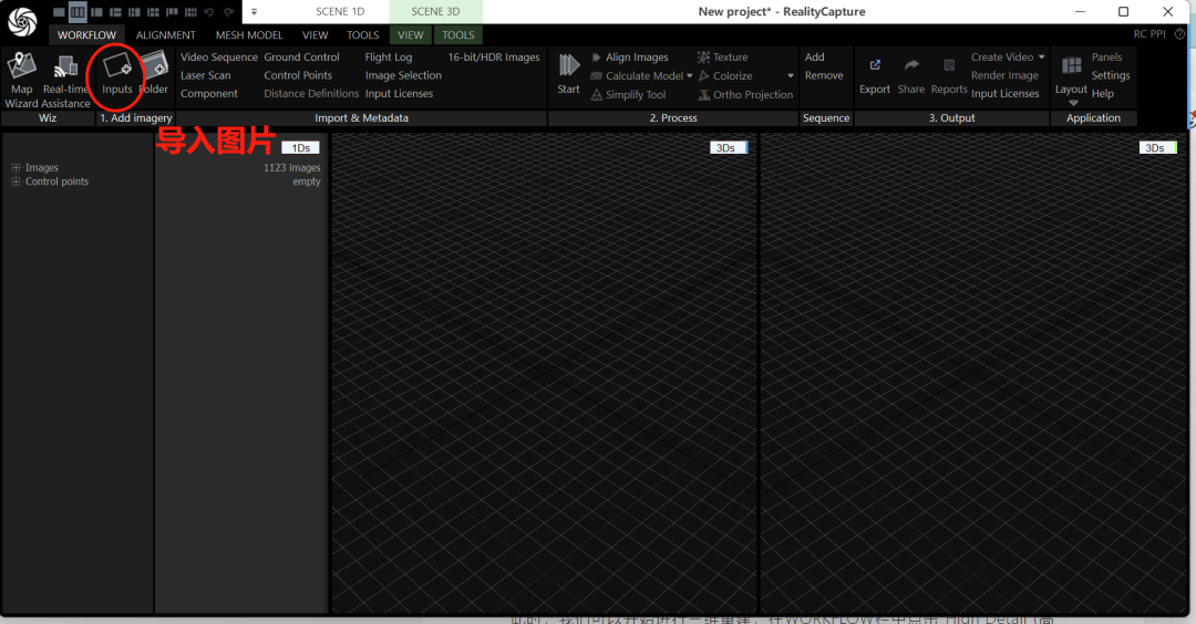 首先我们要将格式工厂转换出来的帧图片导入Reality Capture里: