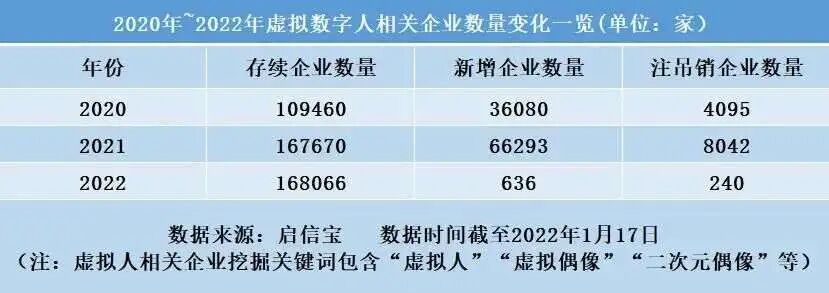 创业公司同样掀起了虚拟人投资热潮。2021年7月,打造迪丽热巴虚拟形象迪丽冷巴的次世文化完成了500万美金的A轮融资,由创世伙伴CCV领投,顺为资本跟投;两个月后,主推虚拟演员的广州虚拟影业有限公司完成了来自峰瑞资本领投的超千万元Pre-A轮融资。启信宝数据显示,2020年~2022年,虚拟人相关企业数量呈现逐渐快速增长趋势。其中,2020年虚拟人相关企业新增数量为36080家,到了2021年,这一数据变成了66293家。截至目前,国内虚拟人相关企业存续数量超16万家。2022年过了不到一个月,虚拟人领域融资数量近百起,融资金额达4.11亿元。