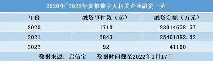 从投资领域看,目前大多数投资集中在虚拟主播、虚拟偶像等制作上。数据显示,2020年虚拟人相关企业融资共有1713起,融资金额为2301亿元;短短一年后,这一领域的投资事件增长至2843起,融资金额为2540亿元。