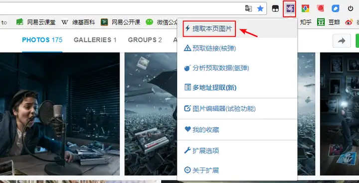 2、第二个插件叫图片助手,可以用来提取出网页上的图片,使用场景是这样的:当你在一个网站上看到一张好看的图片、想把它保存下来,常规操作是右键--图片另存为,但有些网站(比如500px)为了保护图片的版权,会把图片另存为这个选项隐藏起来,这时就需要这个插件派上用场了: