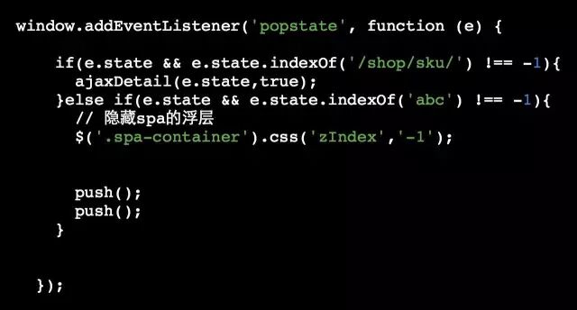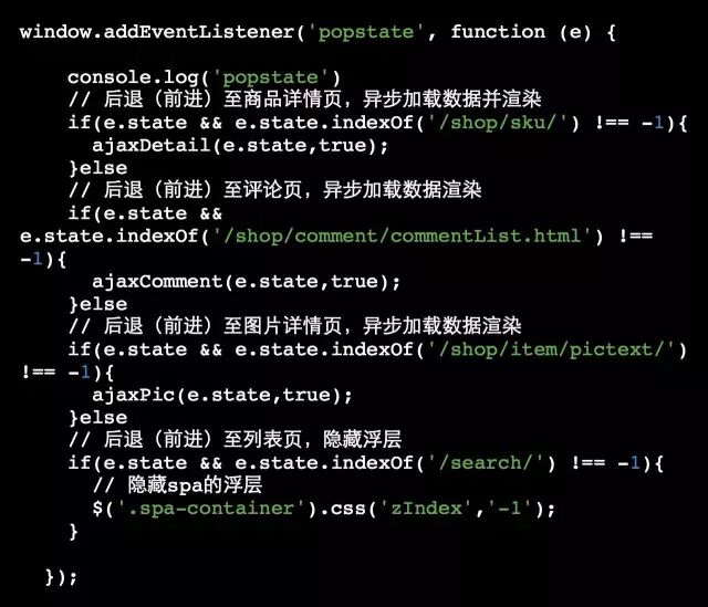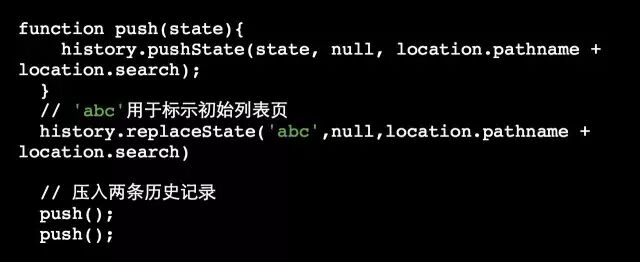最后一次后退需要回到列表页,而在初始化阶段我们给列表页设置了state为abc,特殊的标示该路由,因此在popState事件处理中,我们就可以根据该项回到初始页: