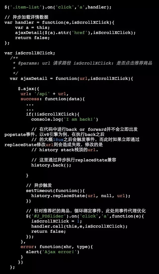 在此处实现,通过isScrollXClick变量判断是否点击的是推荐商品,如果不是则需要执行back操作,下移指针。此时指针是指在第二层,但是浏览器和第二层历史记录的url仍为初始化设定的url,因此需要修改,在这里异步修改当前url。