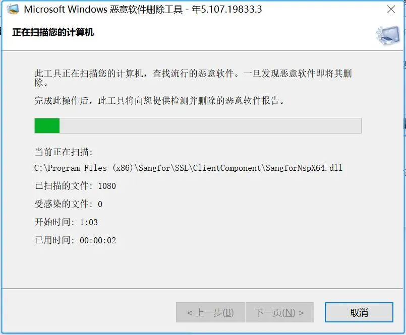 2.点确定后会跳出恶意软件删除工具对话框,点击下一步对电脑中的恶意软件进行扫描。