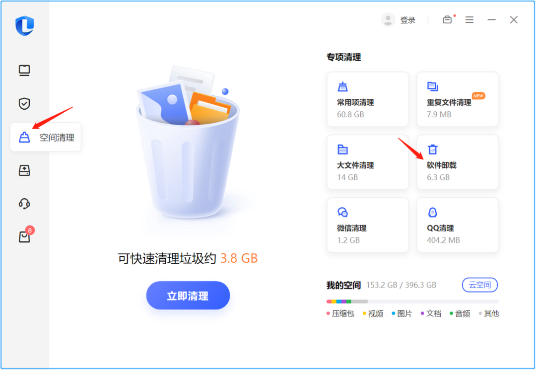1.打开电脑自带的联想电脑管家,点击左侧的清理,再点击右侧的软件卸载。