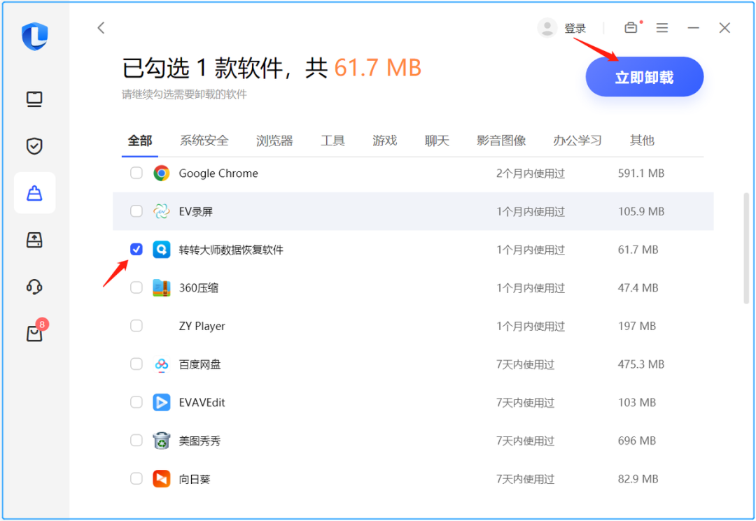 2.在软件卸载界面,勾选流氓软件,点击立即卸载即可!