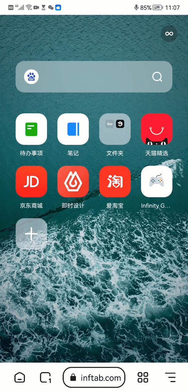 可自定义浏览器主页:主题壁纸、快捷访问、设置第三方主页(默认为 inftab)等。