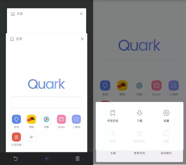 「Quark夸克浏览器」的界面底部只有标签页管理和菜单栏2个按钮,而菜单栏里是常用的功能:书签历史、下载、设置、添加书签、前进等,它们被设计成以卡片的形式堆叠隐藏起来,从而使浏览器的启动页面看起来更加洁简。