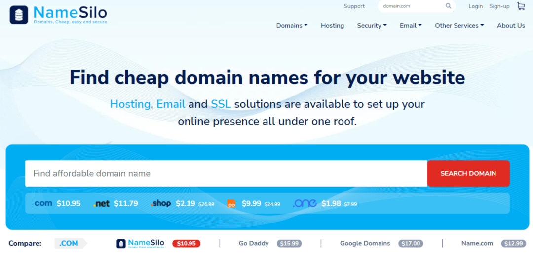 三、NameSilo(https://www.namesilo.com/)namesilo价格低,价格透明,最近我刚买了一个.one的域名,年仅1.98美元,续费大概8美元。我用了好几年啦,一切正常,缺点是它的管理面板设计丑陋、很老旧,并且没有中文版页面,不过听说他们正在改版,期待新版的界面。