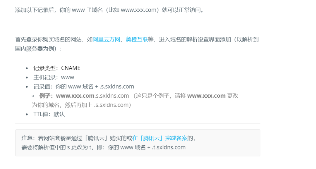记录值:你的主域名/根域名 + .s.sxldns.com例子:xxx.com.s.sxldns.com (这只是个例子,请将 xxx.com 更改为你的域名,然后再加上 .s.sxldns.com)