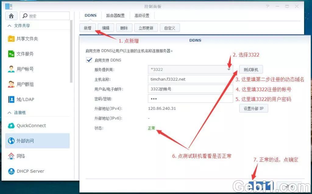 5. 回到群晖控制面板 - 外部访问 - DDNS,点击增加,