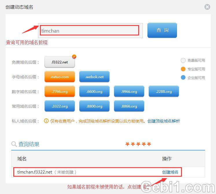 2. 登陆3322管理后台,动态域名 → 域名列表 → 创建动态域名 → 查询一个未用的前缀后 → 选择创建域名
