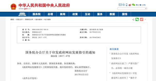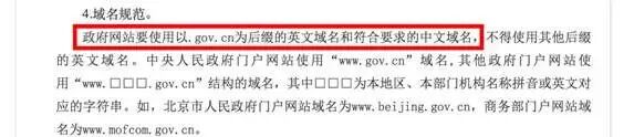 为进一步强加政府网站管理,提升政府网上服务能力,2017年5月15日,国务院通过并印发了《政府网站发展指引》,新规中明确指出政府网站要使用.gov.cn为后缀的英文域名和符合要求的中文域名。