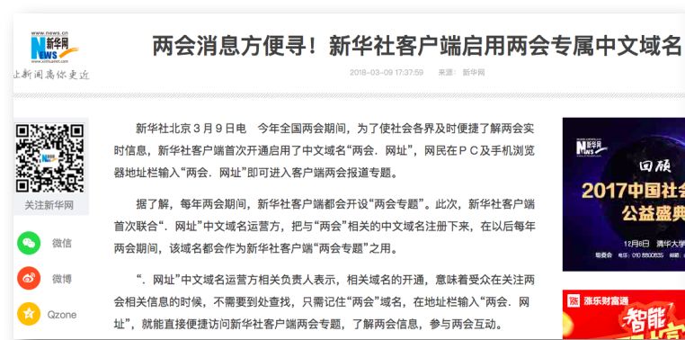 3月份两会报道中新华社客户端首次启用中文域名:两会.网址。