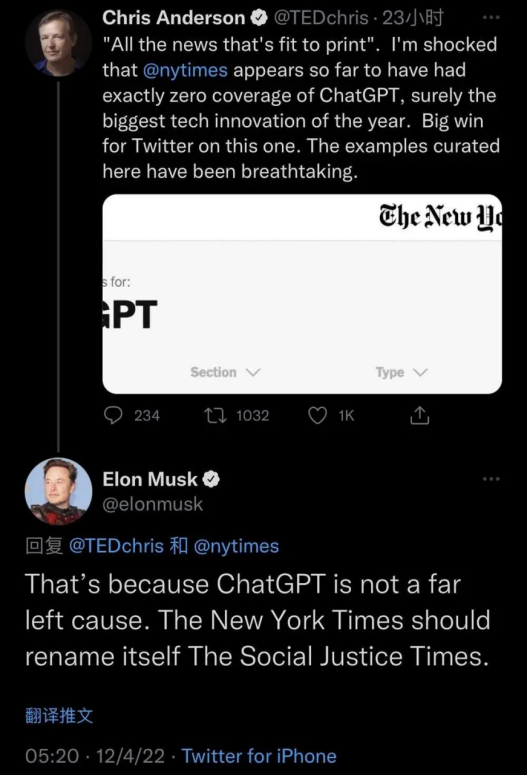 图:TED负责人Chris对纽约时报没有报道ChatGPT表示震惊,马斯克也在下面奚落纽约时报应该改名叫社会正义时报