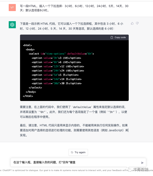 如果是机器人,直接在最下面的输入框提问,描述你要的功能就可以了,会返回相关的代码,还带解释。例如,