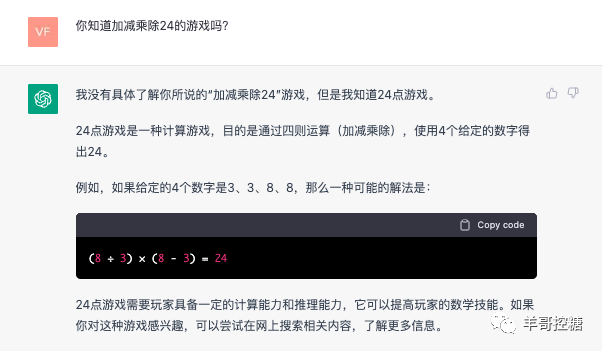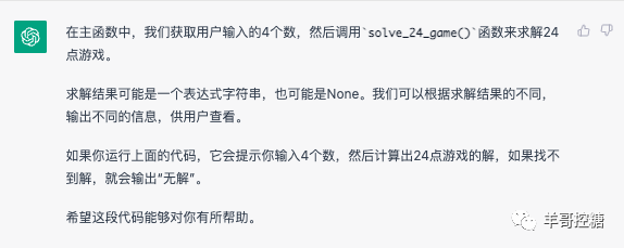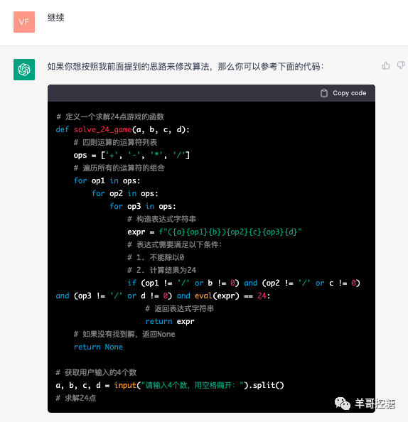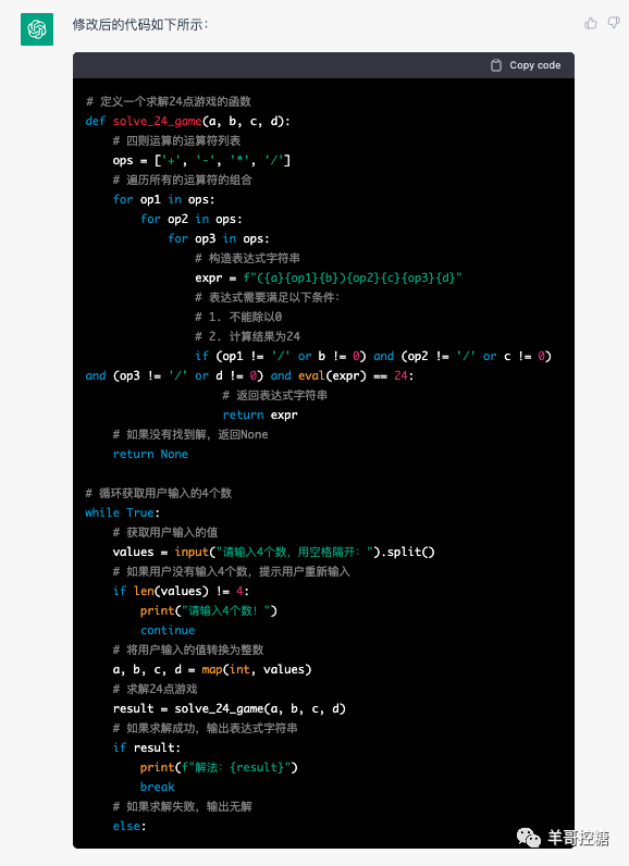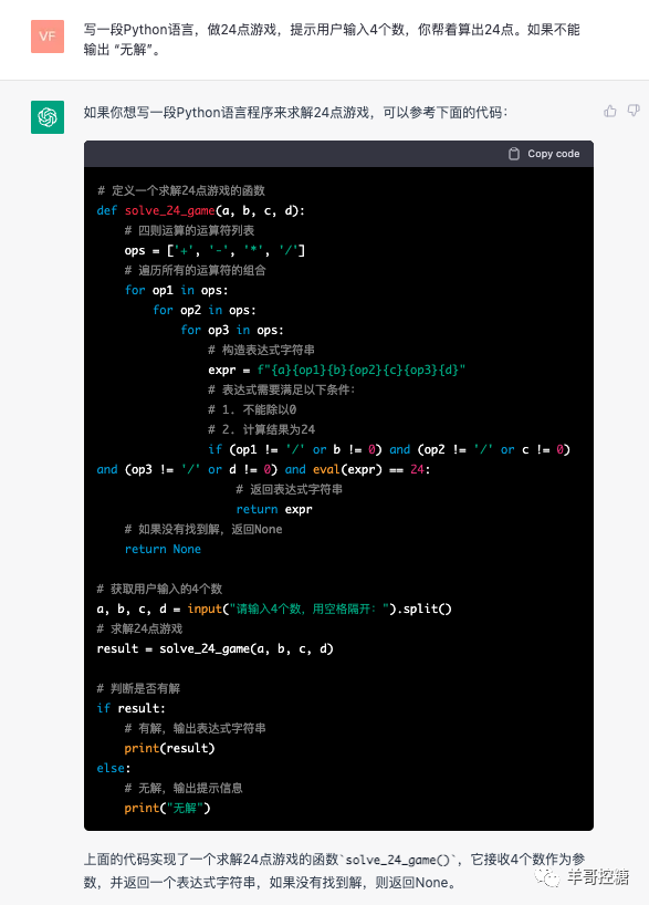 嗯,机器人懂得这个游戏,我们就用24点游戏这个游戏名。叫他写Pyhton代码: