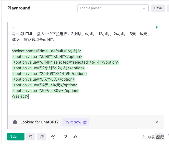 如果是Playground,格式略有不同:是在输入框中,用两行三个连续单引号,中间加上提问,然后点击下面Submit。例如: