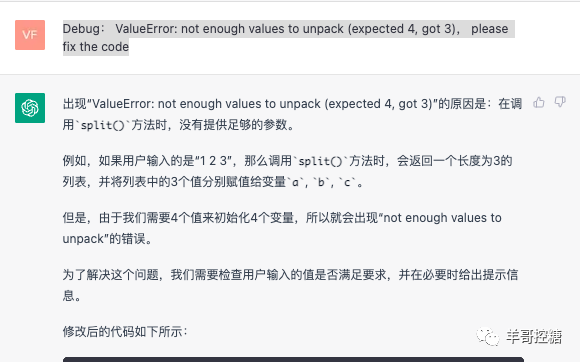 这时,给机器人输入:Debug:ValueError: not enough values to unpack (expected 4, got 3), please fix the code