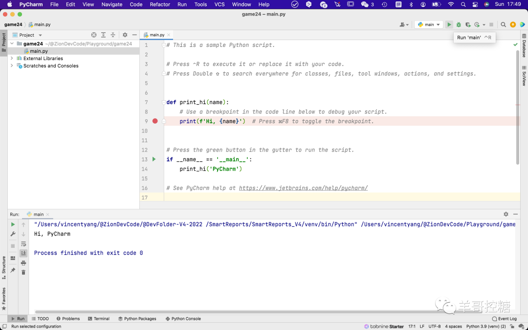 这时,整个main文件已经好了,如果点击右上运行,将显示Hi, Pycharm