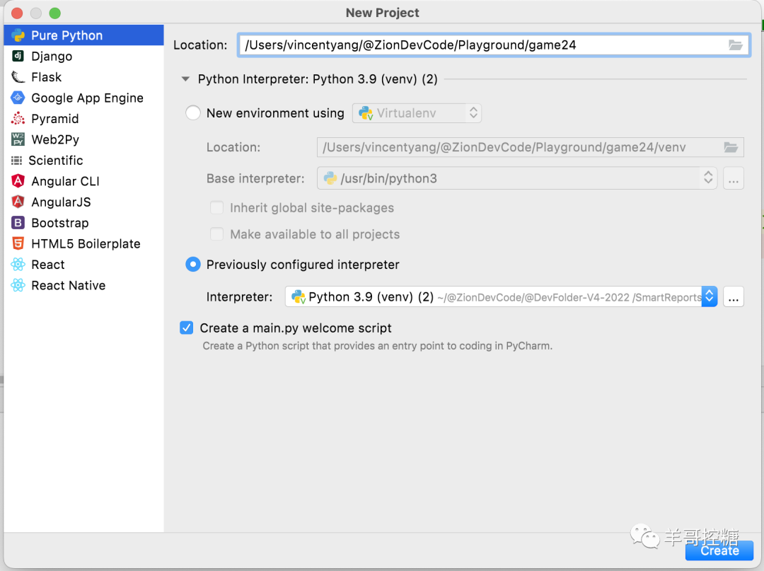 选择Pure Python,存到一个文件夹,注意勾选Create a main.py welcome script", 确认,创建。