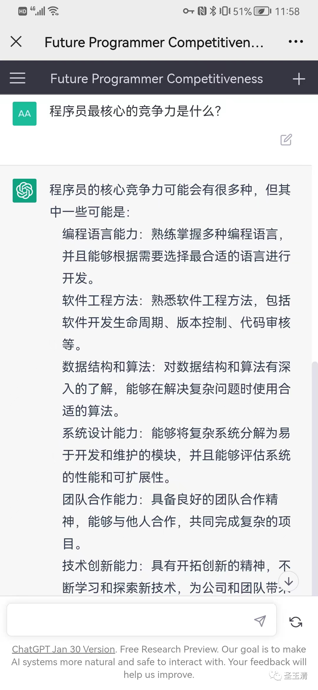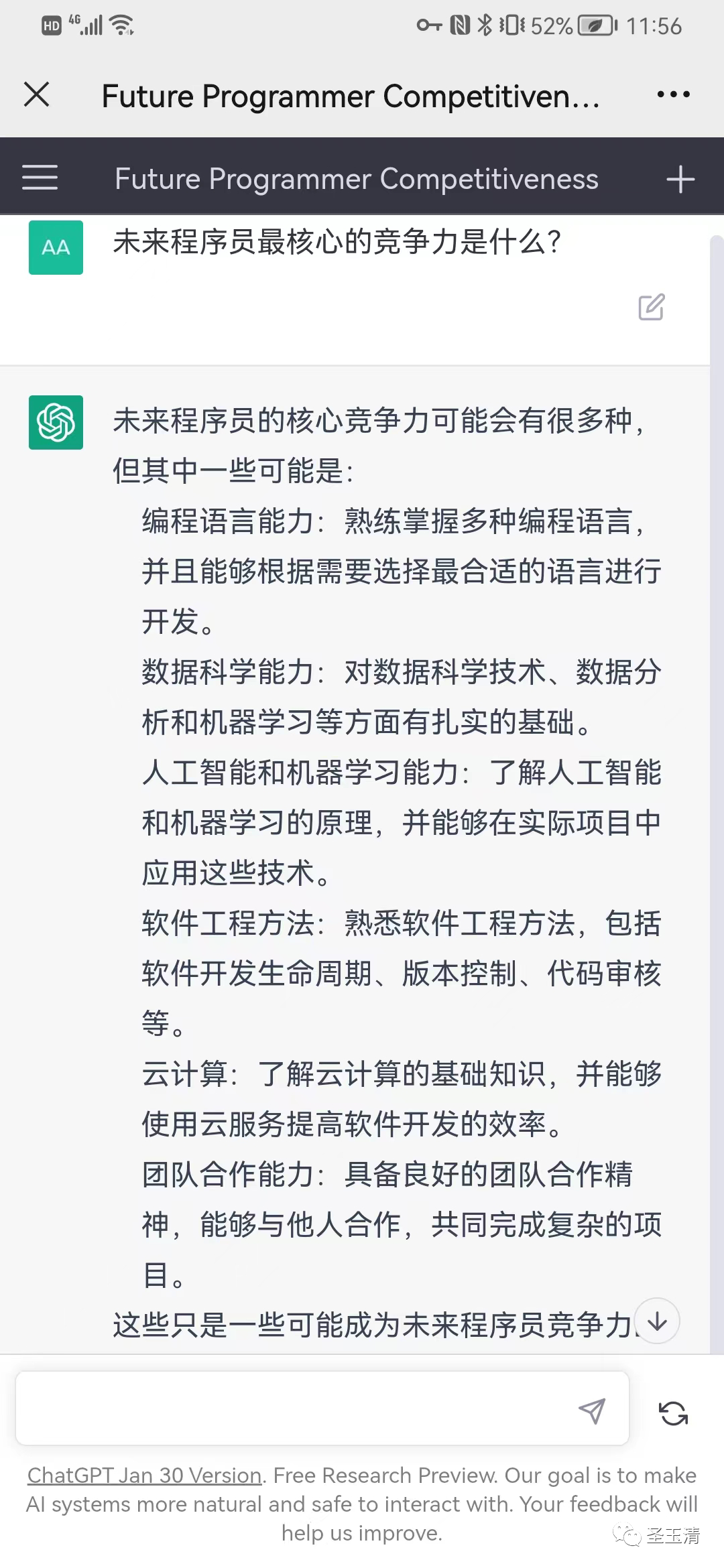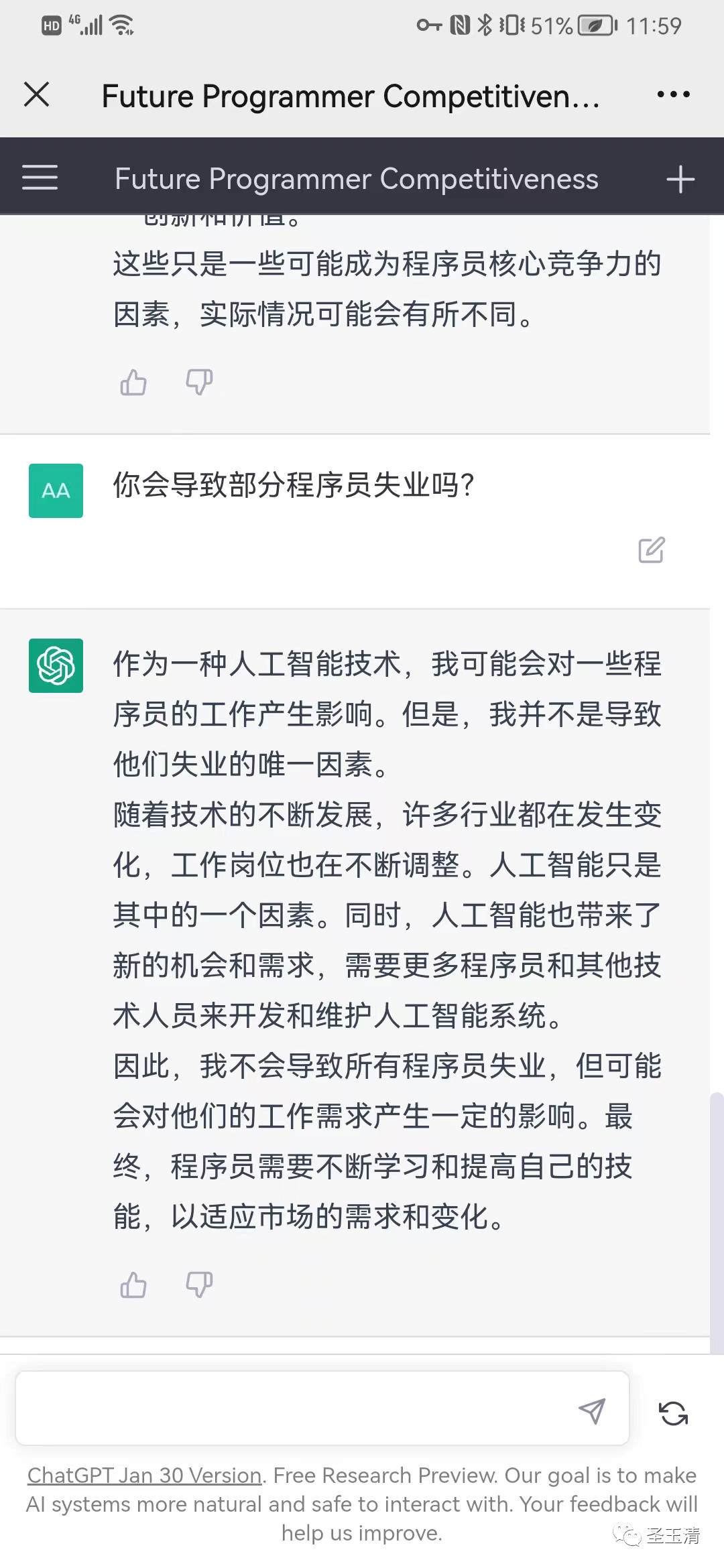 接着我进一步问到你会导致未来少量程序员失业吗?,谁知它的回答谨慎和理性,非常系统化,更是提出程序员要不断学习和提高自己的能力。