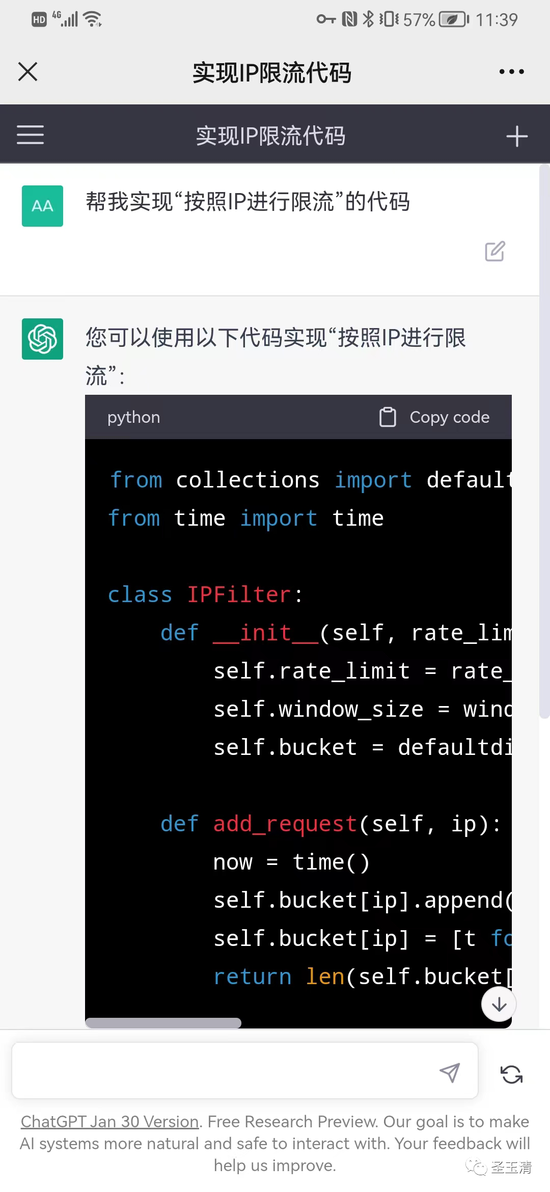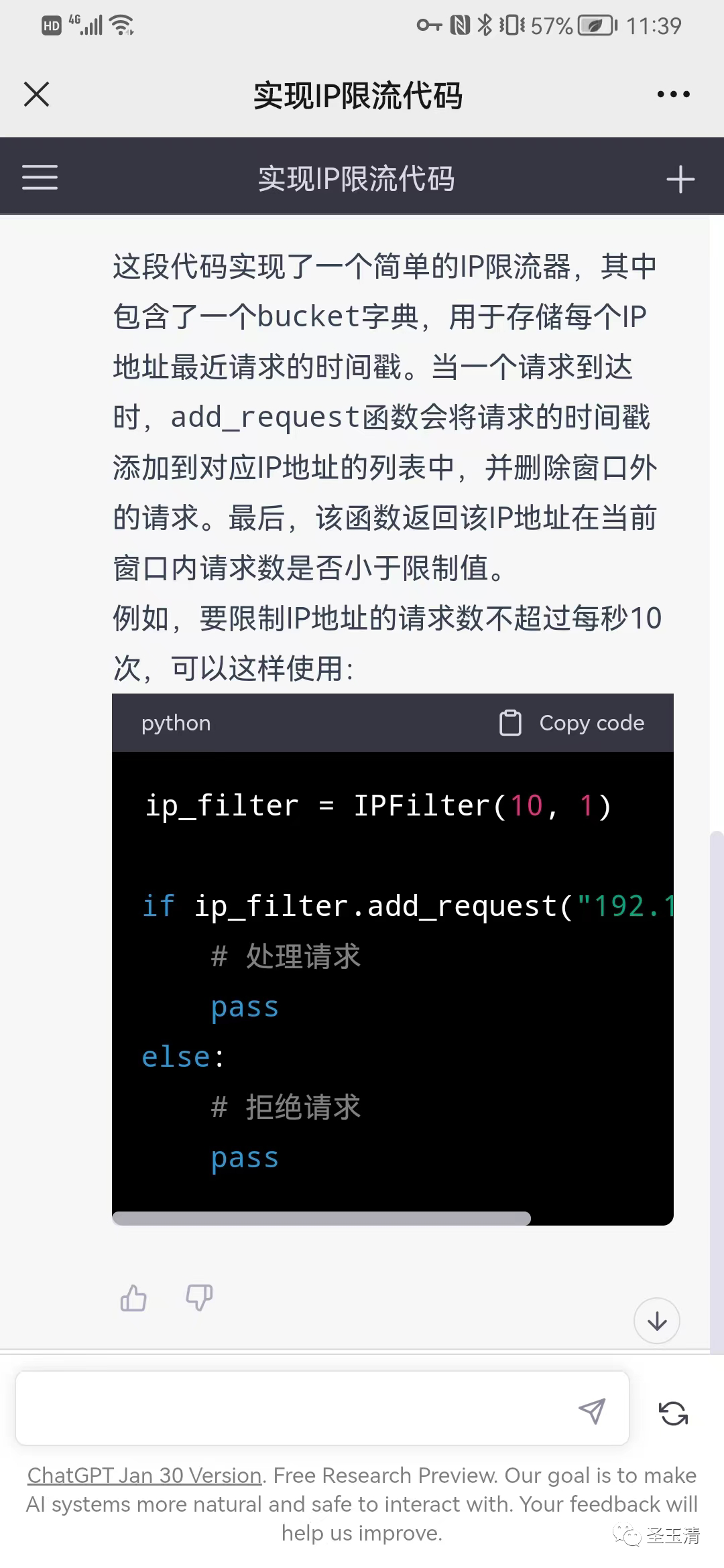 于是我打算考考它,你写一段基于IP的限流算法的代码,接着想了几十秒后,它开始洋洋洒洒写起了代码,最重要的是它还像个面试者,给我讲起了代码思路,我是一头冷汗,这场景太像给应届生笔试了,但它的速度远大于应届生。